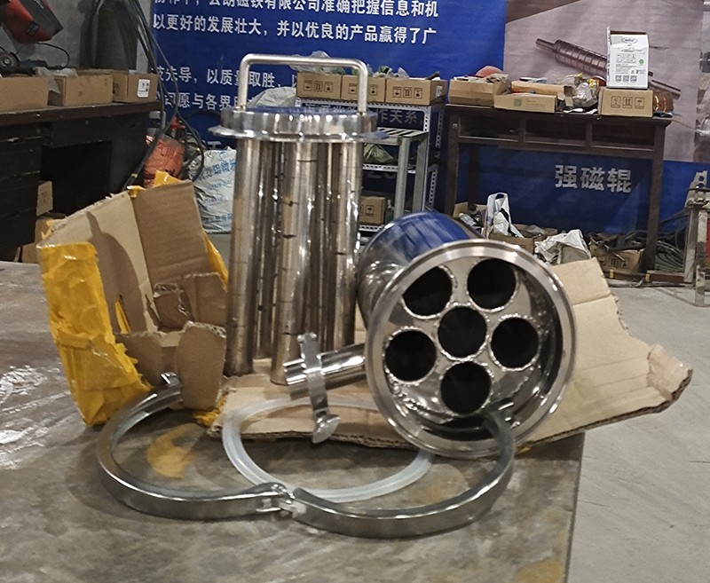 其原理为:当含铁的物质通过时,受到强磁场的吸引力,将含铁的物质牢固的吸附在管壁上,达到保证设备的不受铁杂质的损伤和产品的安全,可以大大降低成品物料中的含铁量。